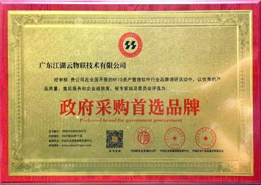 广东江湖云物联技术有限公司在全国开展的RFID资产管理软件行业品牌调研活动中,以优秀的产品质量,售后服务和企业诚信度,被专家组及委员会评选为政府采购首选品牌。
